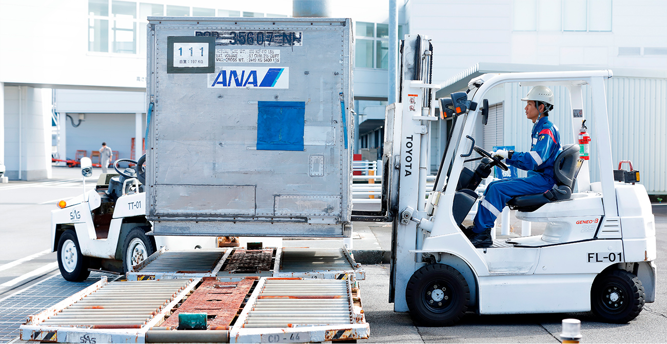 国内、国際航空貨物を取り扱っています。お客様からお預かりした貨物を航空機に搭載する準備や到着した貨物をお客様に引き渡す業務を行っています。